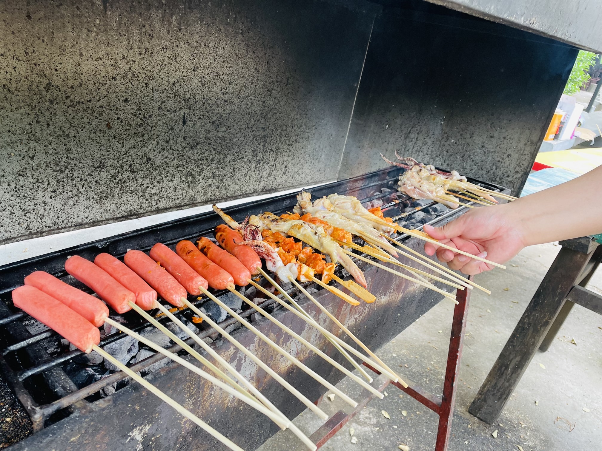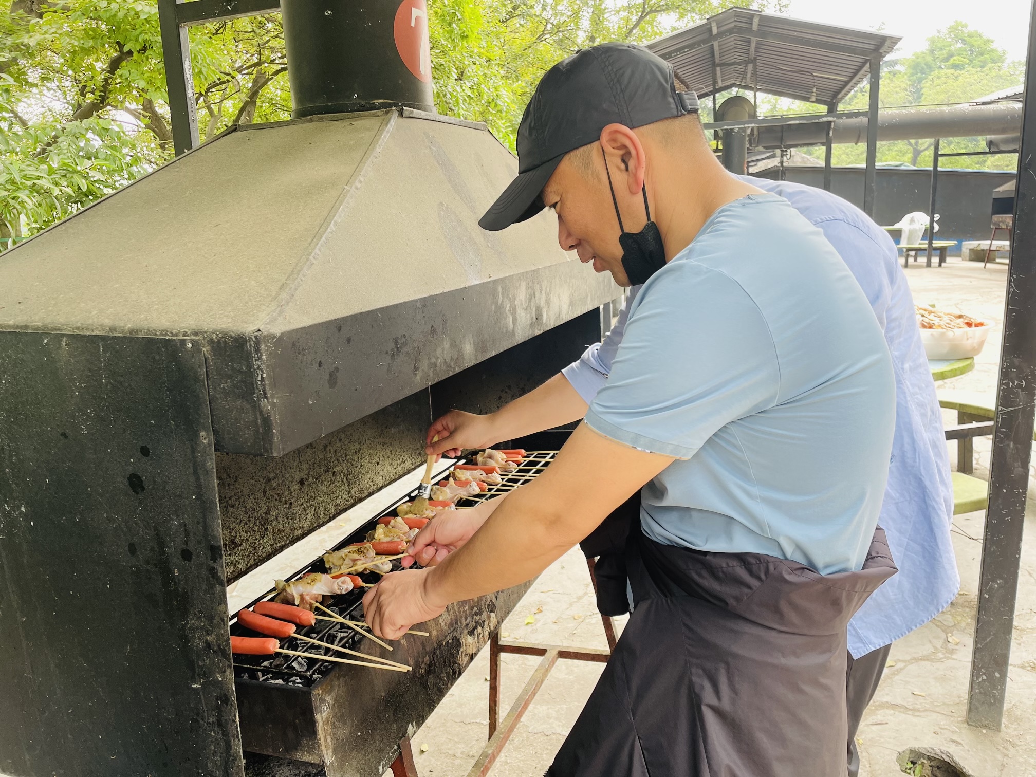 烧烤时间到了,大家分工很明确,女同事负责玩和吃,男同事负责烤烧烤,虽然烤的不是很好,但是大家都吃的都很开心,没有浪费一点食材!炎热的天气加上烧烤炉的温度,真的是辛苦男同事们了!