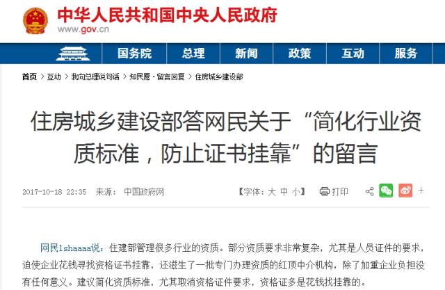 住房城乡建设部答网民关于“简化行业资质标准,防止证书挂靠”的留言